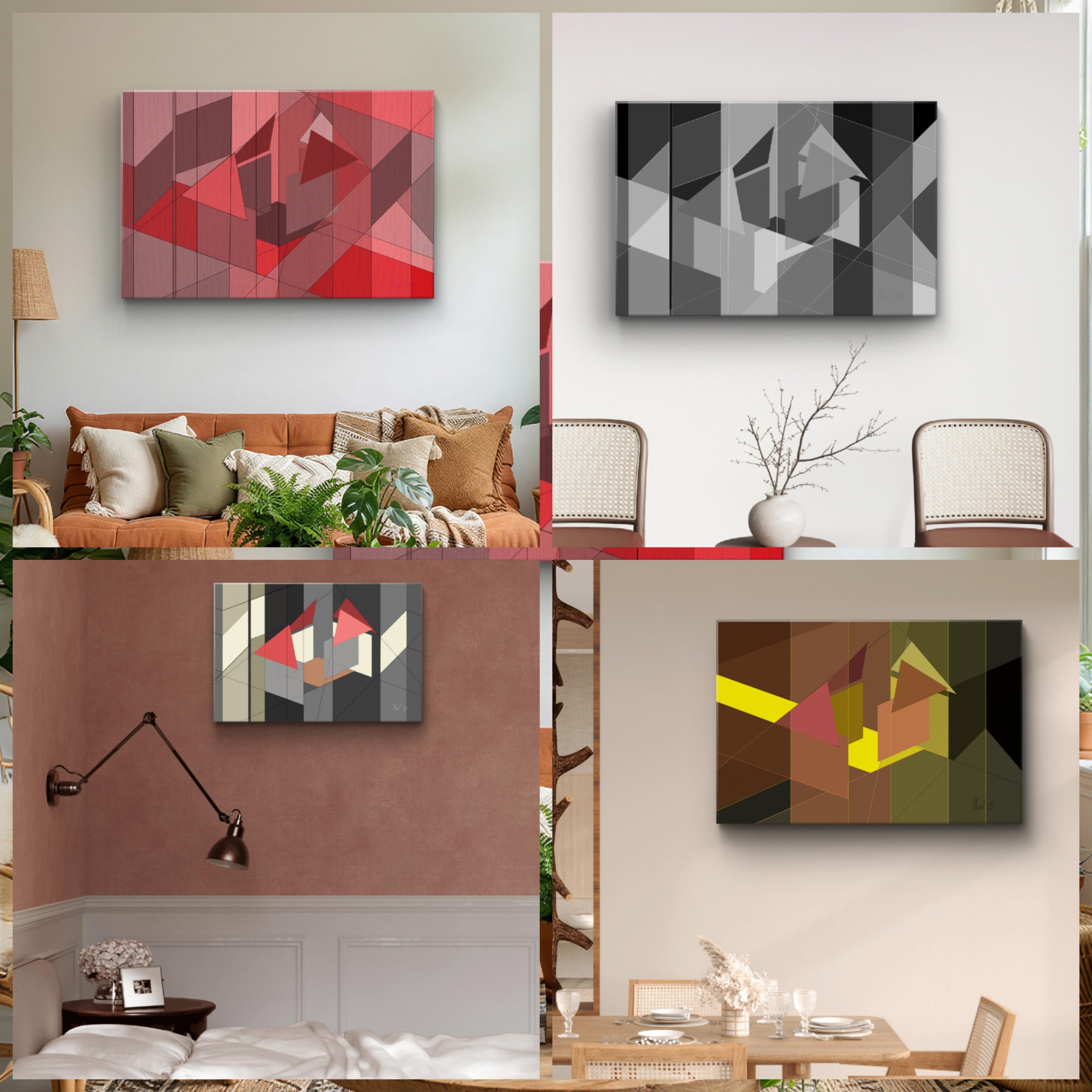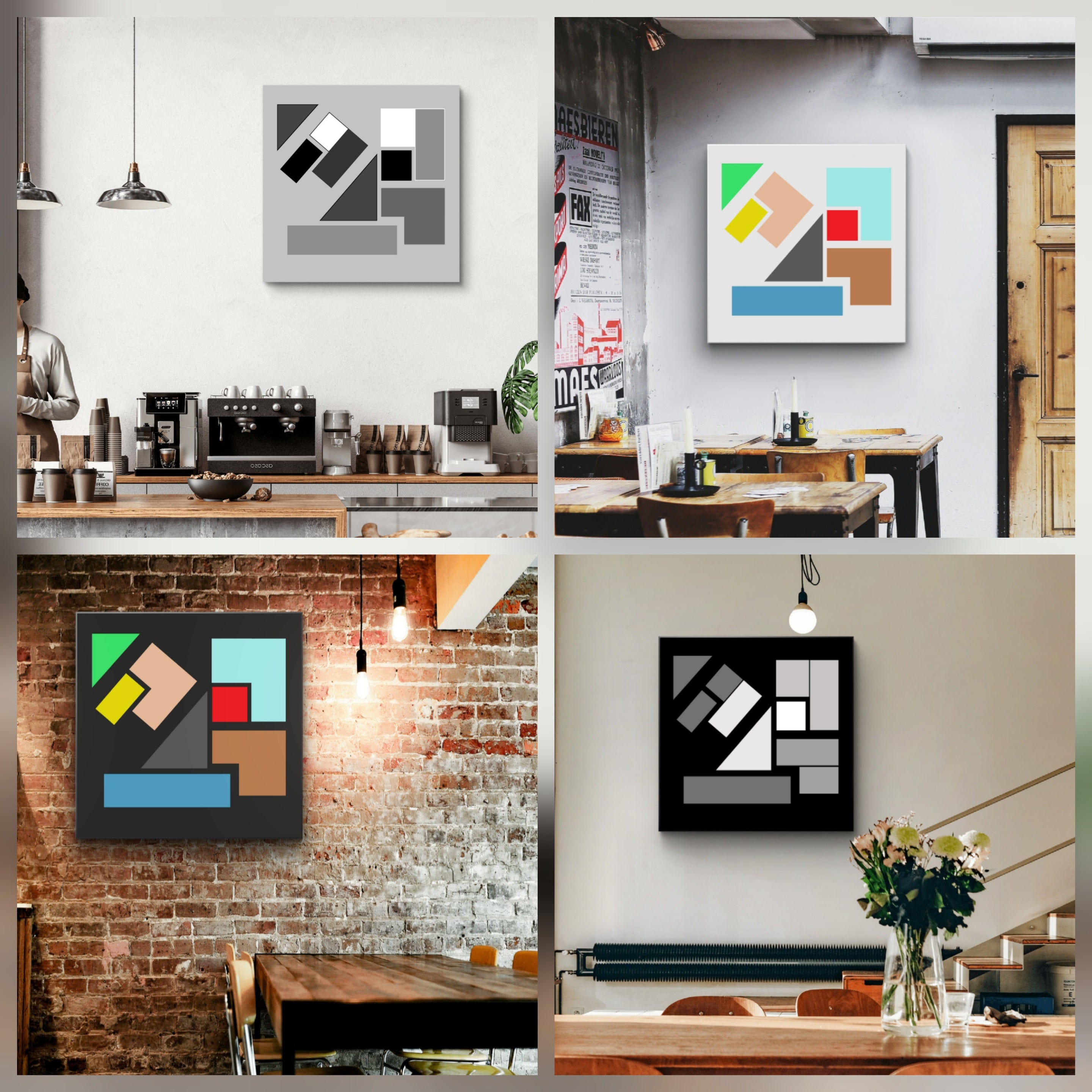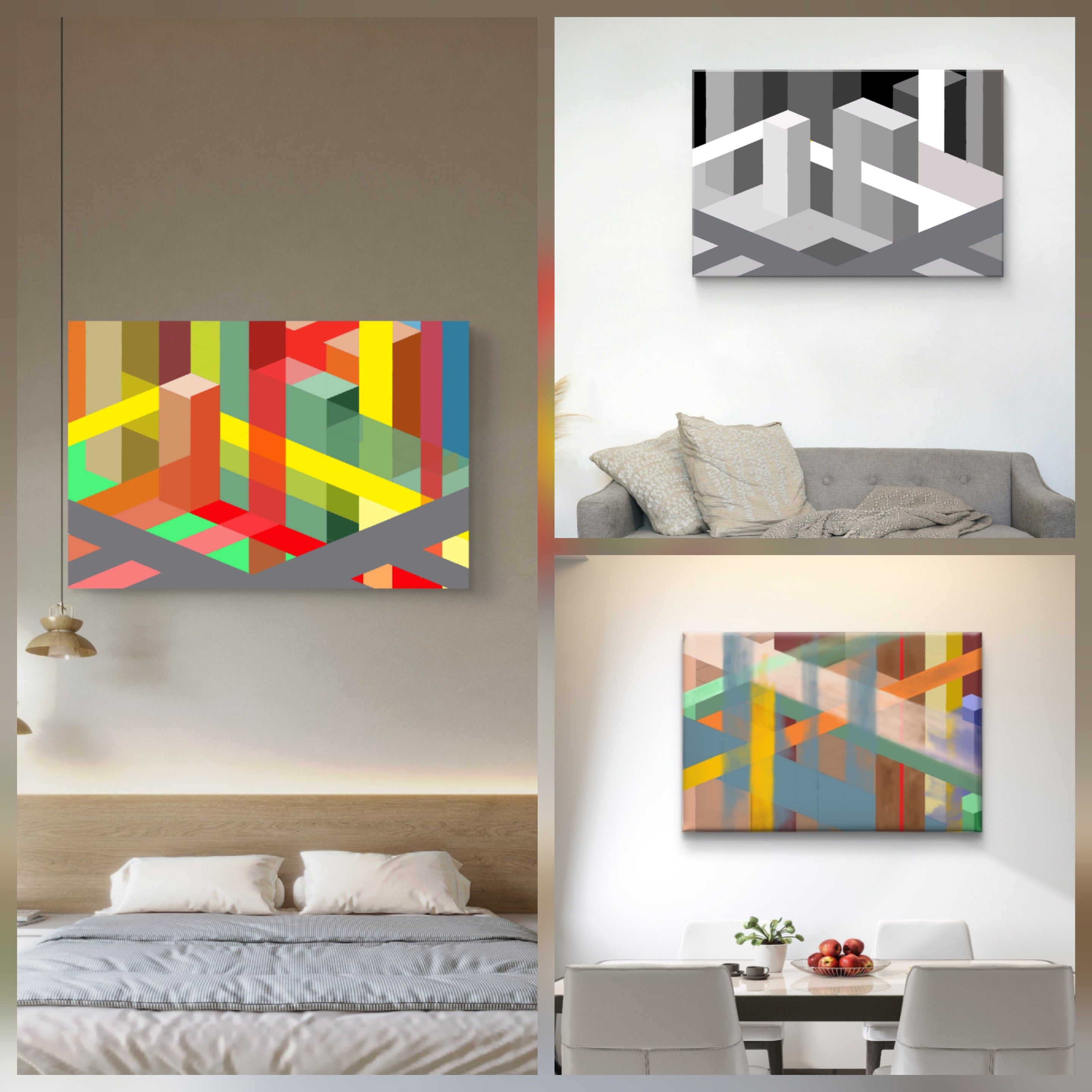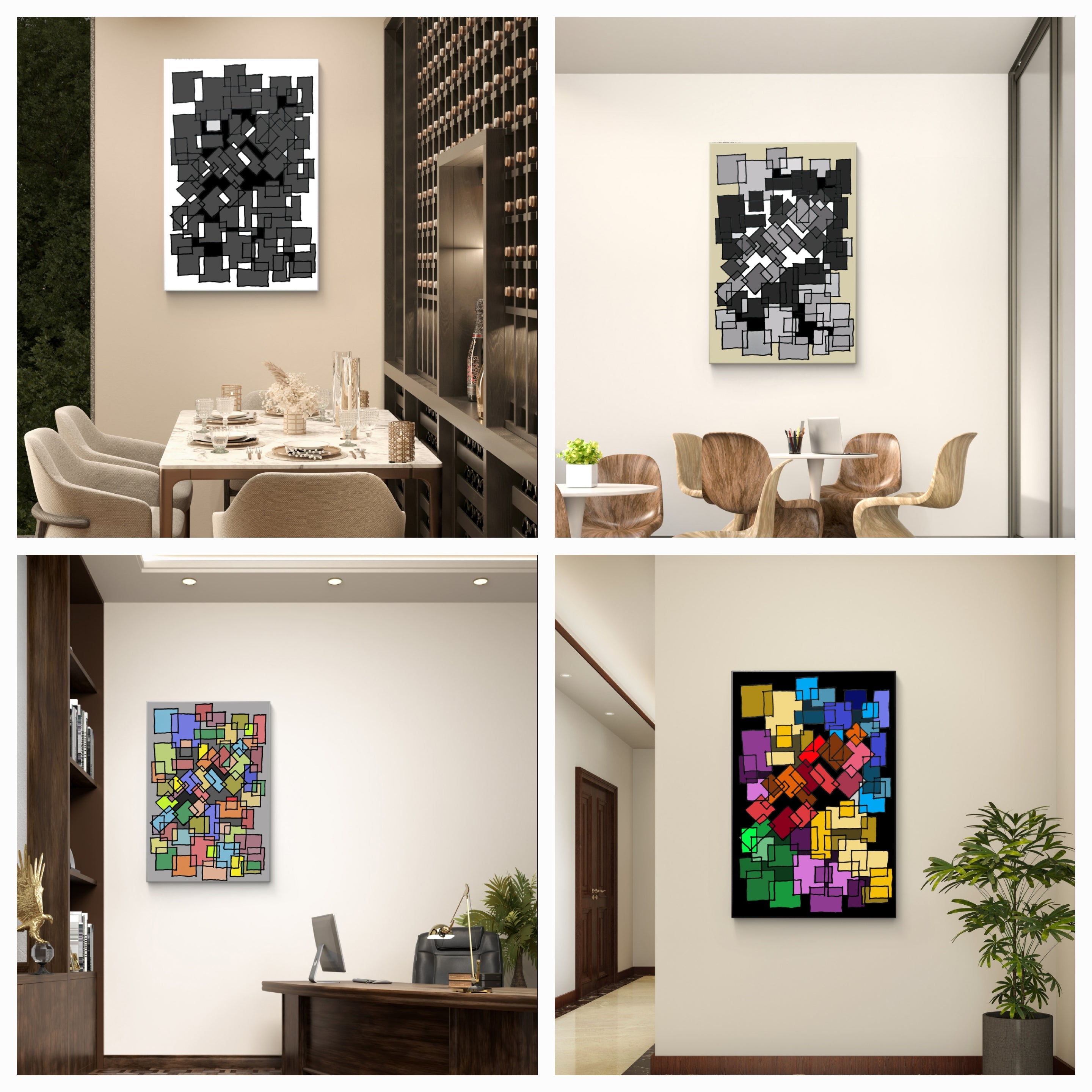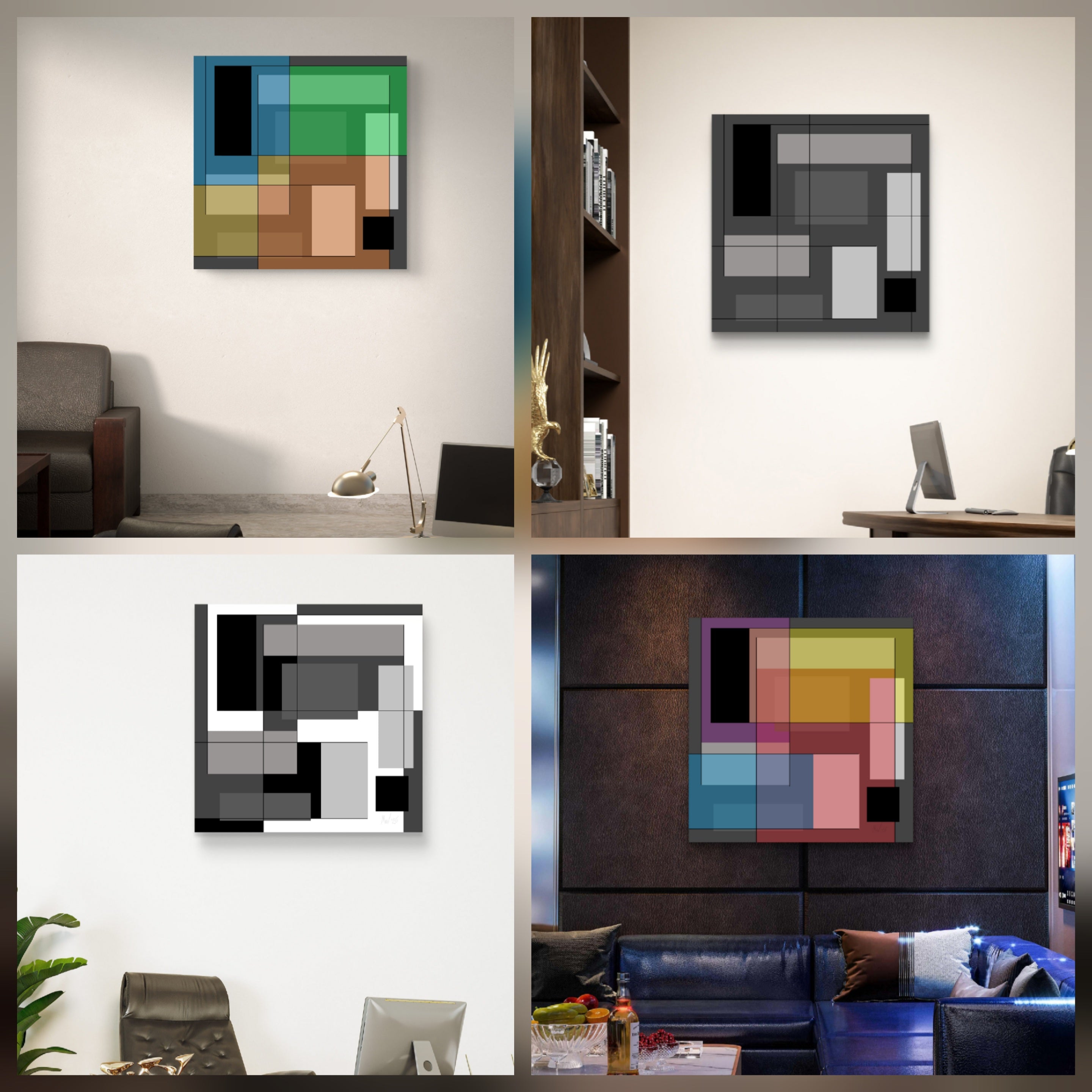 If you are applying these ideas to a real interior, our artworks are created as themed groups to help you achieve balance, scale and cohesion with confidence. Explore these groups of geometric and urban abstracts in the corporate workplace and the home for cohesive interior design across interiors